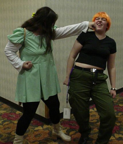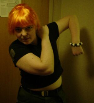 Basically a last minute costume. Used clothing from other costumes. I made the bracelet out of clay. The wig was new.