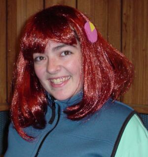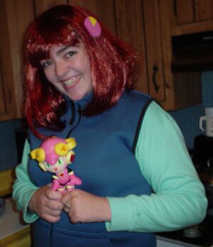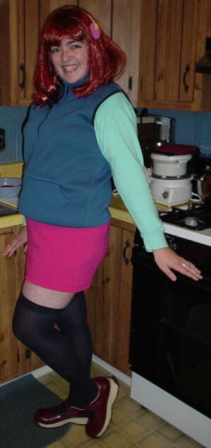 I found the vest, shirt and skit at the Cheswick Goodwill. The stockings are from my Maho costume. The shoes I found at a DSW Shoe Warehouse. The wig was purchased at a Party City. I made the hair pin with craft foam.