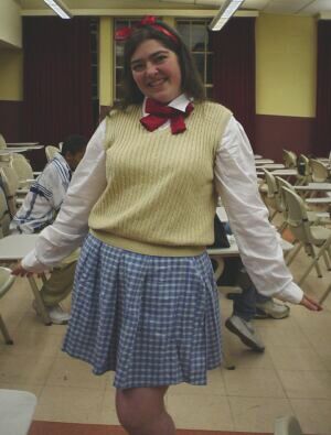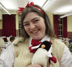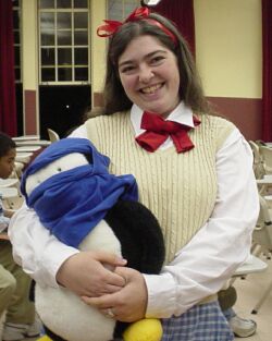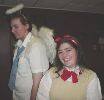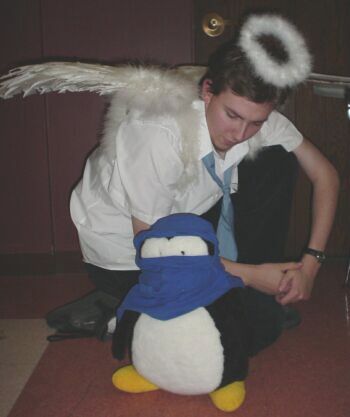 I used the shirt and skirt from my Maho costume. The sweater vest I found at Goodwill. I purchased both the plushie penguins on ebay. I dressed the "Ginji" penguin as a T-shirt ninja. TJ is dressed as Ginji's spirit. His tie is from my Maho costume. Halo was purchased at a costume store.
