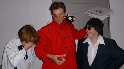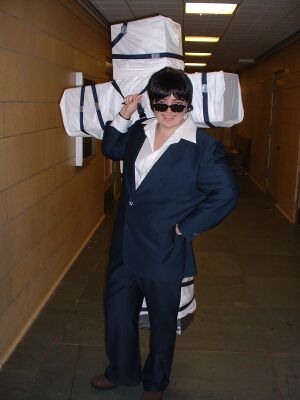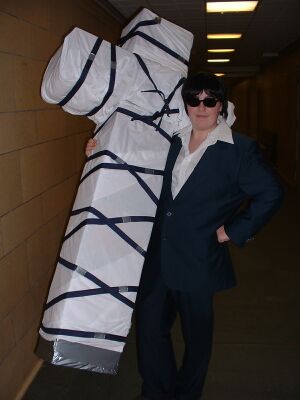This was a pretty easy costume to assemble. I found the shirt and suit at Goodwill. I had to hem the pants and take in the waist. The crosses on the suit were found at Jo-ann Fabrics. I have the official sunglasses too. The cross is the cliche cardboard covered with fabric. It can be disassembled into two pieces to help with transportation.